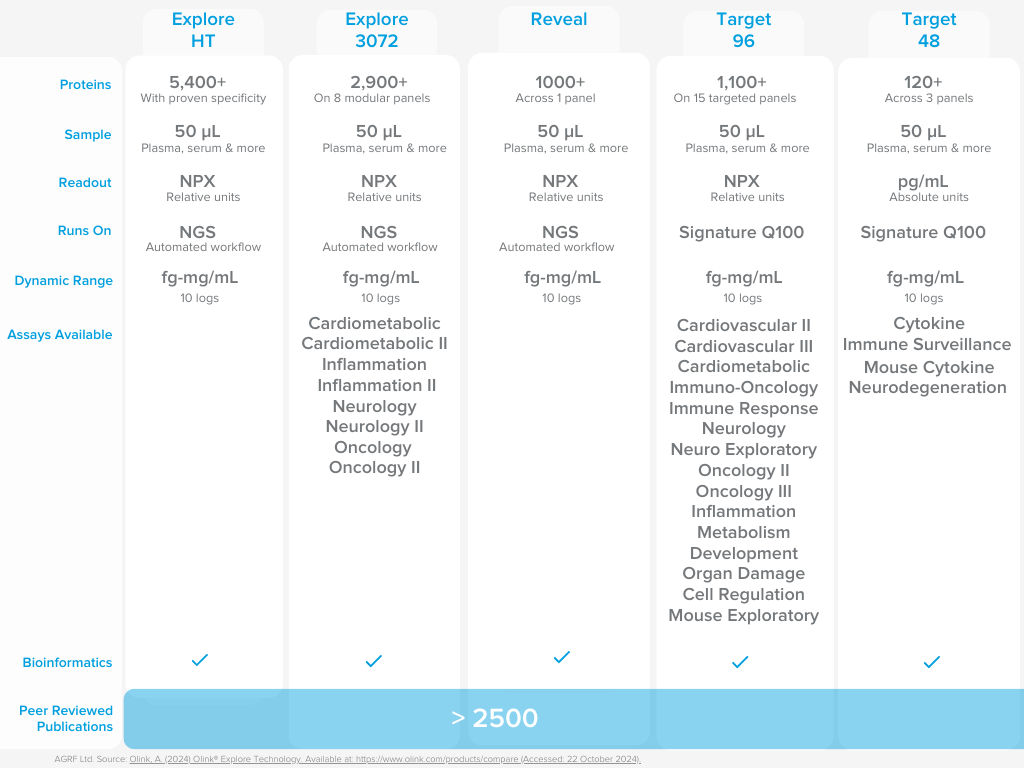 As an Olink® Certified Service Provider, AGRF is proud to be part of a select network of laboratories recognised globally for their expertise in Olink’s superior high-throughput proteomic technology. Our local laboratory provides Australian researchers with direct access to the advanced Olink® Explore HT, Explore 3072, Reveal, Target 96 and Target 48 workflows, enabling cutting-edge protein biomarker discovery and reliable protein quantitation across multiple applications.